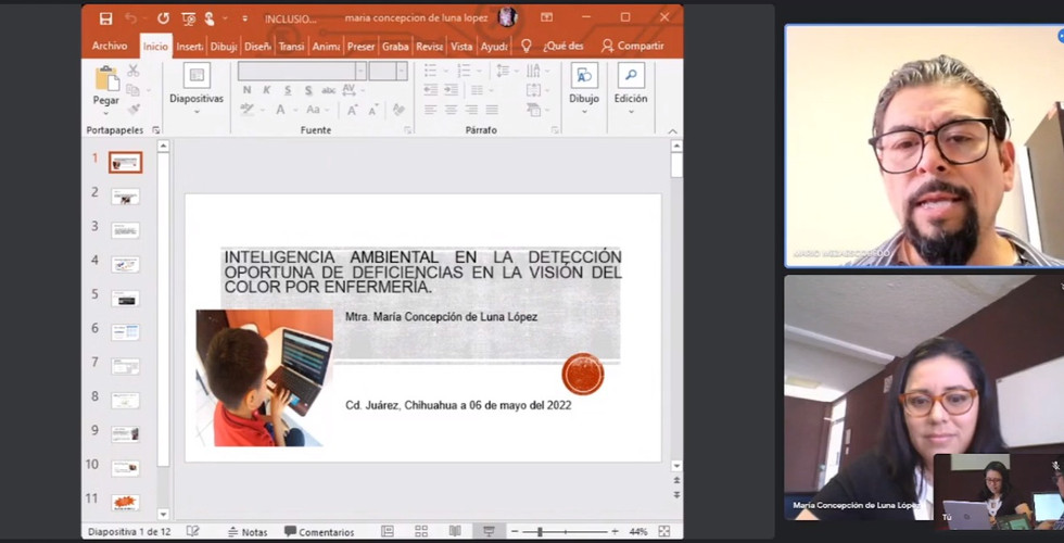 La licenciada se encargó de presentar su proyecto de investigación con el uso de tecnología aplicada a la salud, acompañada por el M.C. Francisco Javier Luévano de la Rosa, que consistió en la detección oportuna de las deficiencias en la visión del color, tomando como muestra a un grupo de niños rarámuris.