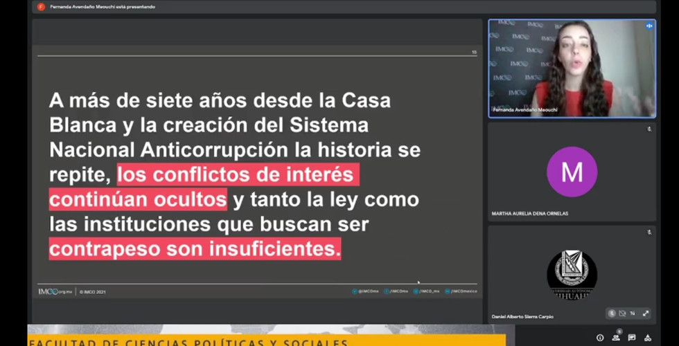 La licenciada Fernanda Avendaño Meouchi, impartió una conferencia virtual de un tema sumamente interesante, pertinente para el contexto del escenario nacional actual titulada “Conflicto de interés en el gobierno y como afecta en la competencia”.